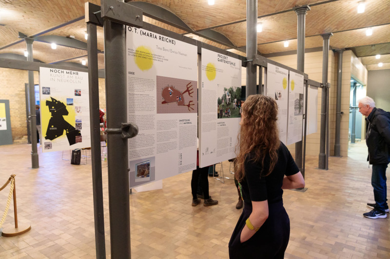 Die Ausstellung im Foyer des Kulturstalls im Schloss Britz präsentiert zwei Kunst-am-Bau-Projekte an Neuköllner Bildungseinrichtungen: die Kunst am Bau der Grundschule am Koppelweg sowie am Kinder- und Jugendzentrum Blueberry. Im Fokus stehen dabei die zwölf Wettbewerbsbeiträge, darunter die prämierten Entwürfe „Schnörkel“ von Christin Kaiser und „Vulkangarten“ von Valeska Peschke und deren Umsetzungsvorhaben. Die ausgestellten Entwürfe veranschaulichen, wie Künstler*innen die Besonderheiten der jeweiligen Gebäude sowie die Bedürfnisse ihrer Nutzer:innen berücksichtigen, um einzigartige und ortsspezifische Kunstwerke zu schaffen.